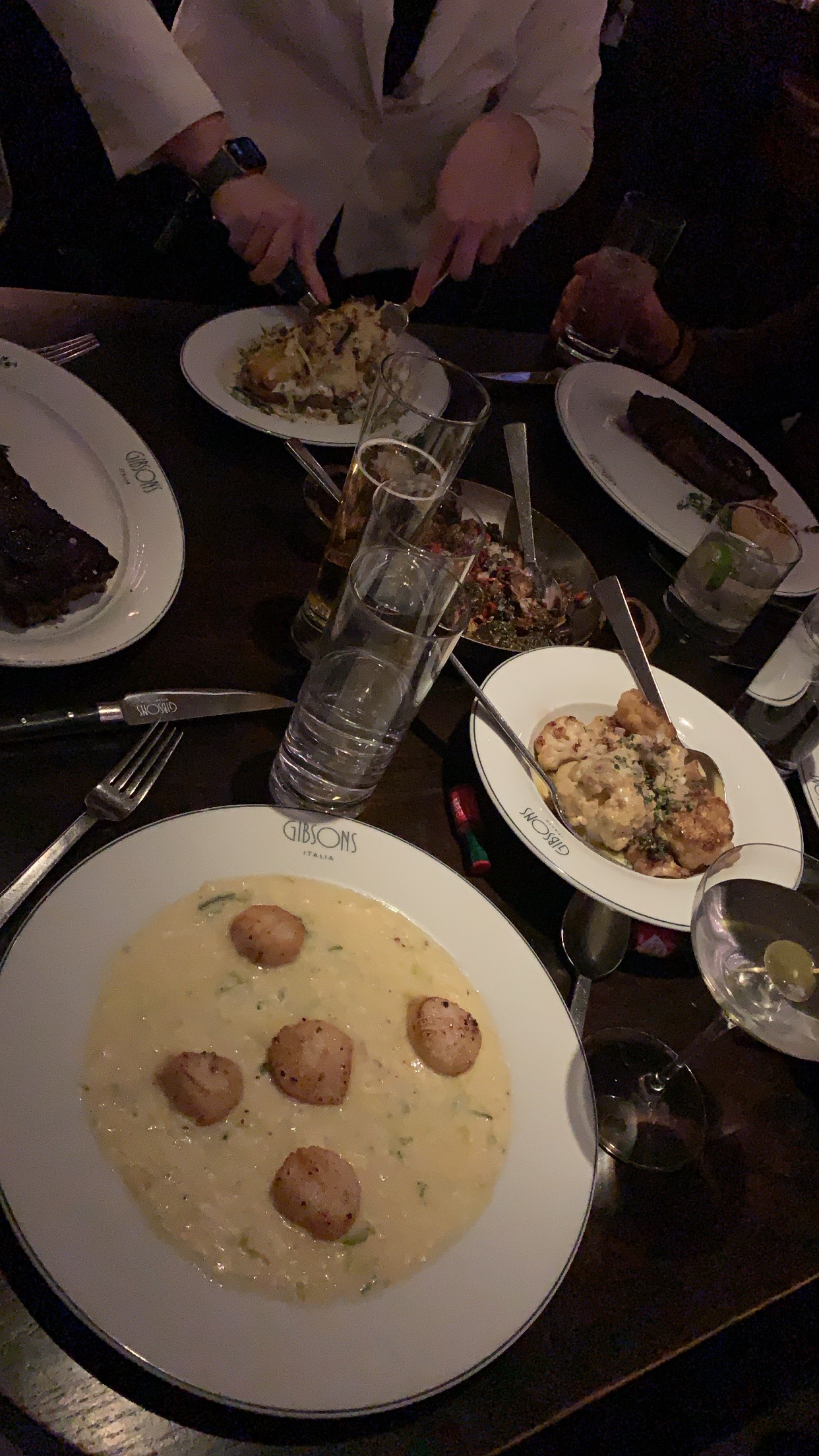 Gibsons Italia – (Not to be confused with Gibsons Steakhouse – we learned the hard way these are two different places!) This was the perfect place to dine for dinner. The bar vibe was awesome and even though we had a reservation for upstairs we were able to grab a booth at the bar and decided to eat there. The drinks were phenomenal! I started with the Cosmopolitan, then had a dirty martini with blue cheese olives, and of course I had to try a fancy wine with my dinner, and for dessert, and espresso martini! Everything was just SO GOOD. For apps we had the Mini Royal Platter Cotto & Crudo which was (half lobster, alaskan king crab, 4 oysters & 4 shrimp), as well as the Italia Meatballs (corso ricotta & pecorino romano). For my dinner it was between the Spicy Rigatoni and the 7-Year Aged Acquerello Risotto but I can never pass up a banging risotto and I was so satisfied with my choice! For sides we had the Crispy Brussel Sprouts and the Double Baked Potato with Ricotta – MMMMM! For dessert, the Banana Gelato – all the good flavors!