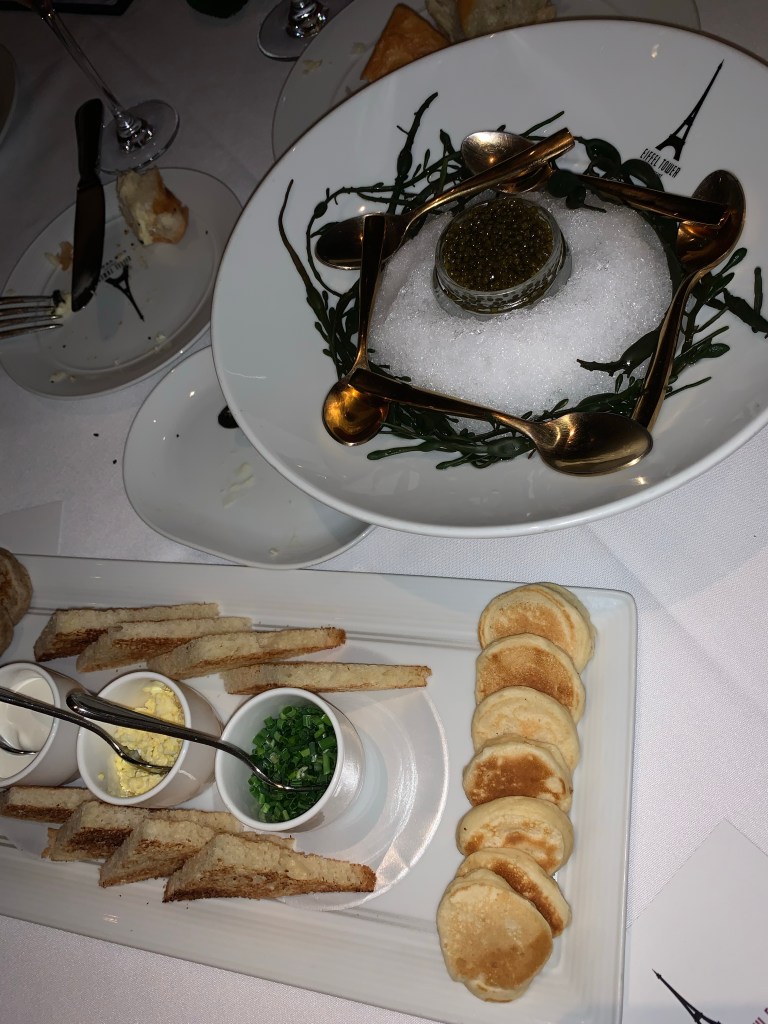 - Eiffel Tower Restaurant – Eiffel Tower Restaurant is a French fine-dining restaurant located in the Paris Las Vegas Hotel and Casino on the Las Vegas Strip. The restaurant is located on the 11th floor of the replica Eiffel Tower, offering panoramic views of the Las Vegas Strip and the surrounding desert. The menu features classic French cuisine with an emphasis on seafood and steak. The restaurant has an elegant and romantic atmosphere, with dim lighting and a dress code that requires patrons to wear upscale, semi-formal attire. The prices are on the higher side, but it’s worth it for the quality of the food and the spectacular views. Eiffel Tower Restaurant is open for dinner, typically from 5 pm to 10 pm and reservations are recommended, as the restaurant can fill up quickly.