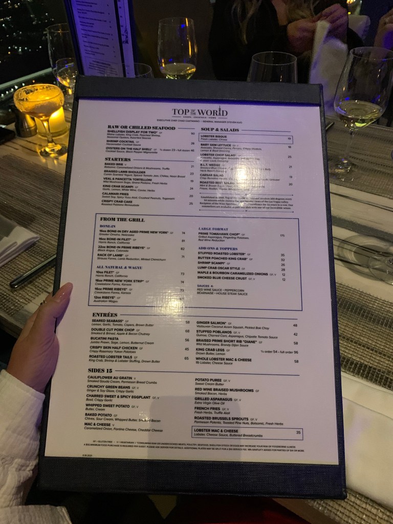 - Top of the World Dinner @ Stratosphere – Top of the World is a fine dining restaurant located in the Stratosphere Tower in Las Vegas. The restaurant’s menu focuses on contemporary American cuisine with a focus on steak and seafood, and the atmosphere is chic and upscale. Top of the World is situated on the 106th floor of the tower, offering panoramic views of the Las Vegas Strip and the surrounding desert. You circle the entire stratosphere while eating dinner with a stunning view of beautiful Las Vegas. Top of the World is a great option for those who want to experience a delicious dinner with a breathtaking view of the Las Vegas Strip.